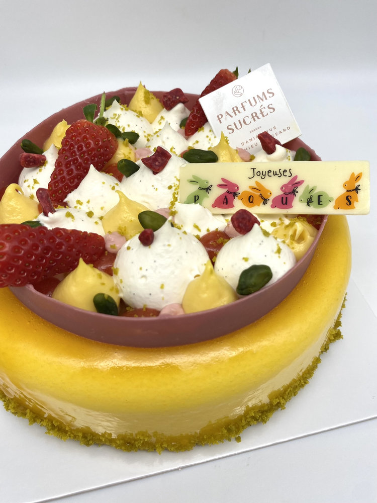 Un entremets aux saveurs fruitées et délicates, composé d’une crème onctueuse passion, d’un crémeux fraise, d’un confit fraise & passion, d’un biscuit moelleux et d’un croustillant pistache irrésistible !