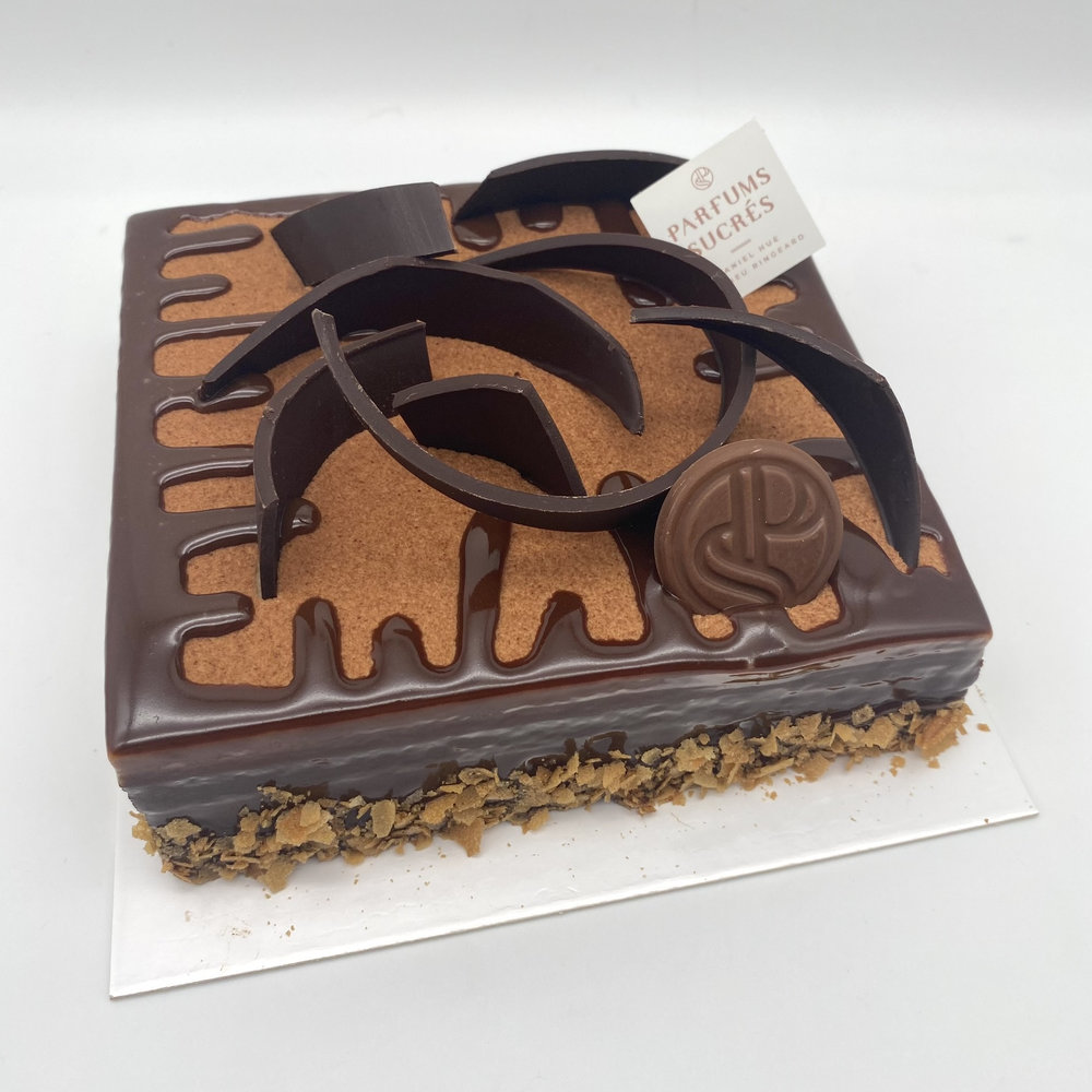 Mousse chocolat noir, mousse chocolat lait, biscuit chocolat, croustillant praliné.