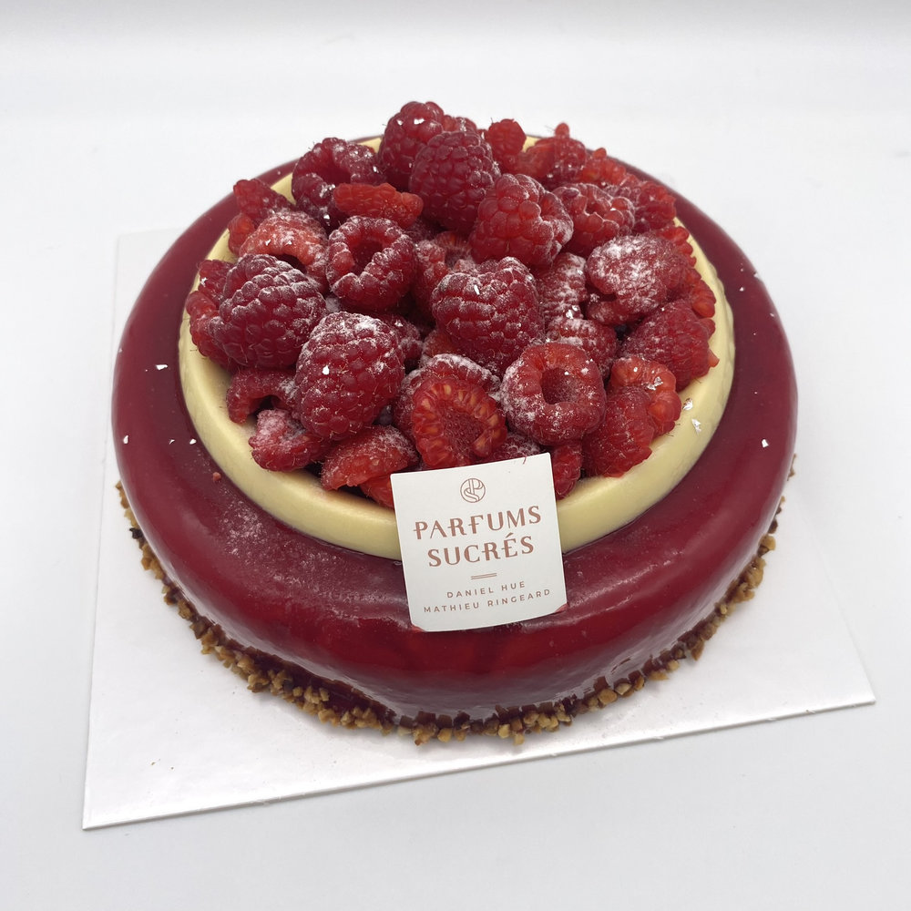 Crème diplomate vanille, confit framboises pépins, framboises fraîches sur fond biscuit pain de Gênes