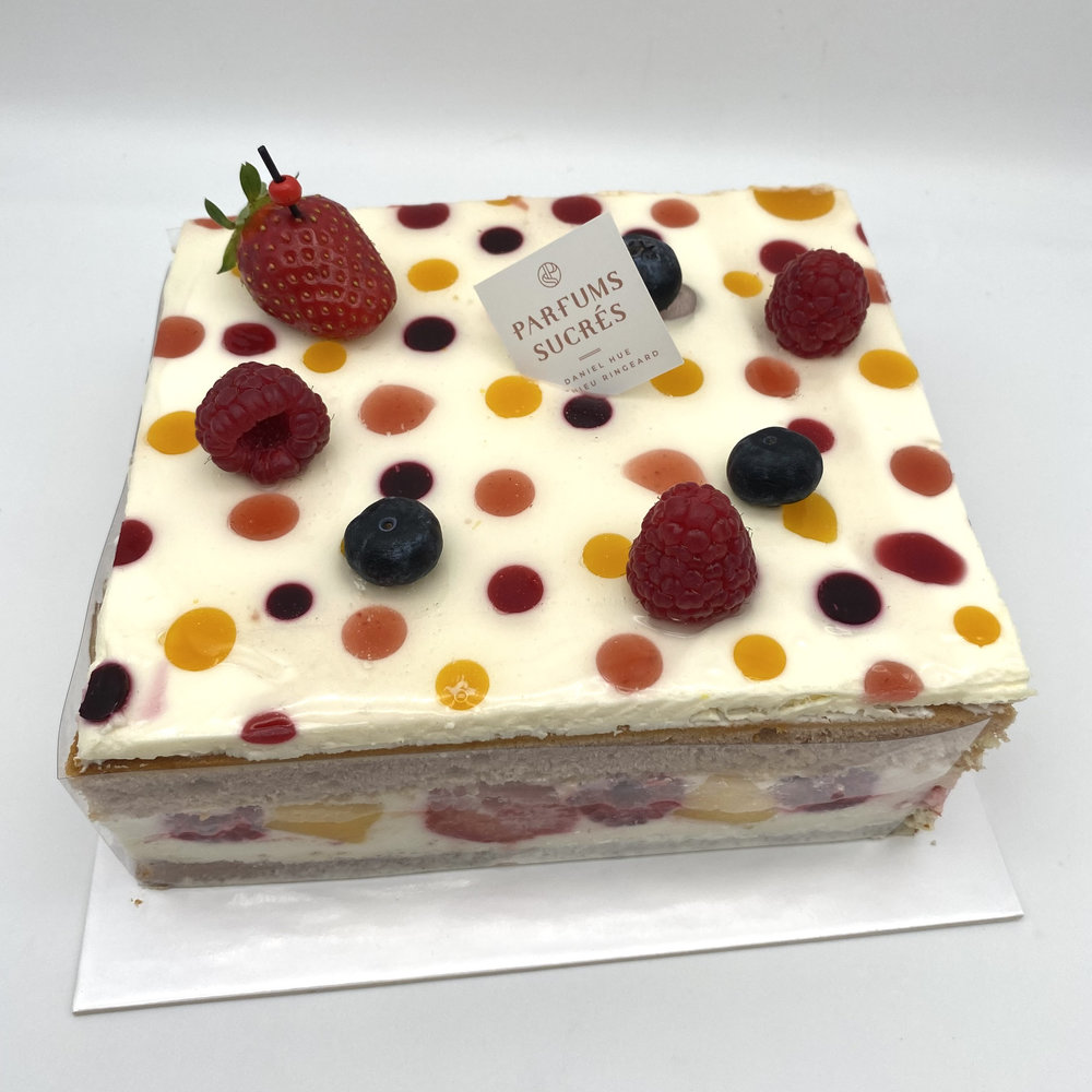Crème légèrement citronnée, cocktail de fruits frais, biscuit superposé aux fruits rouges