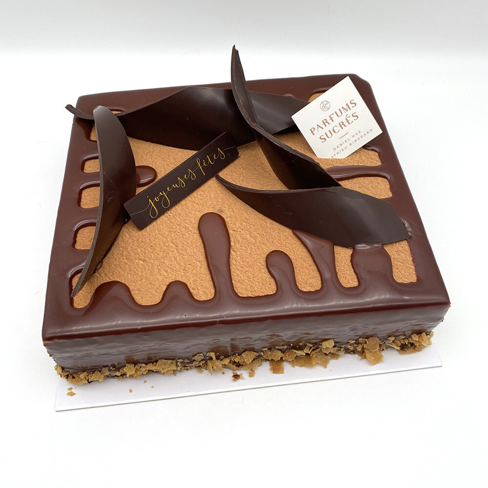 mousse chocolat noir et lait, crémeux caramel, biscuit noisette et croustillant.
