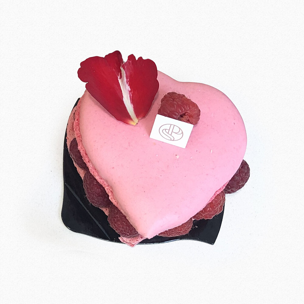 Macaron framboise, crème à la rose, confit de litchis, framboises fraîches