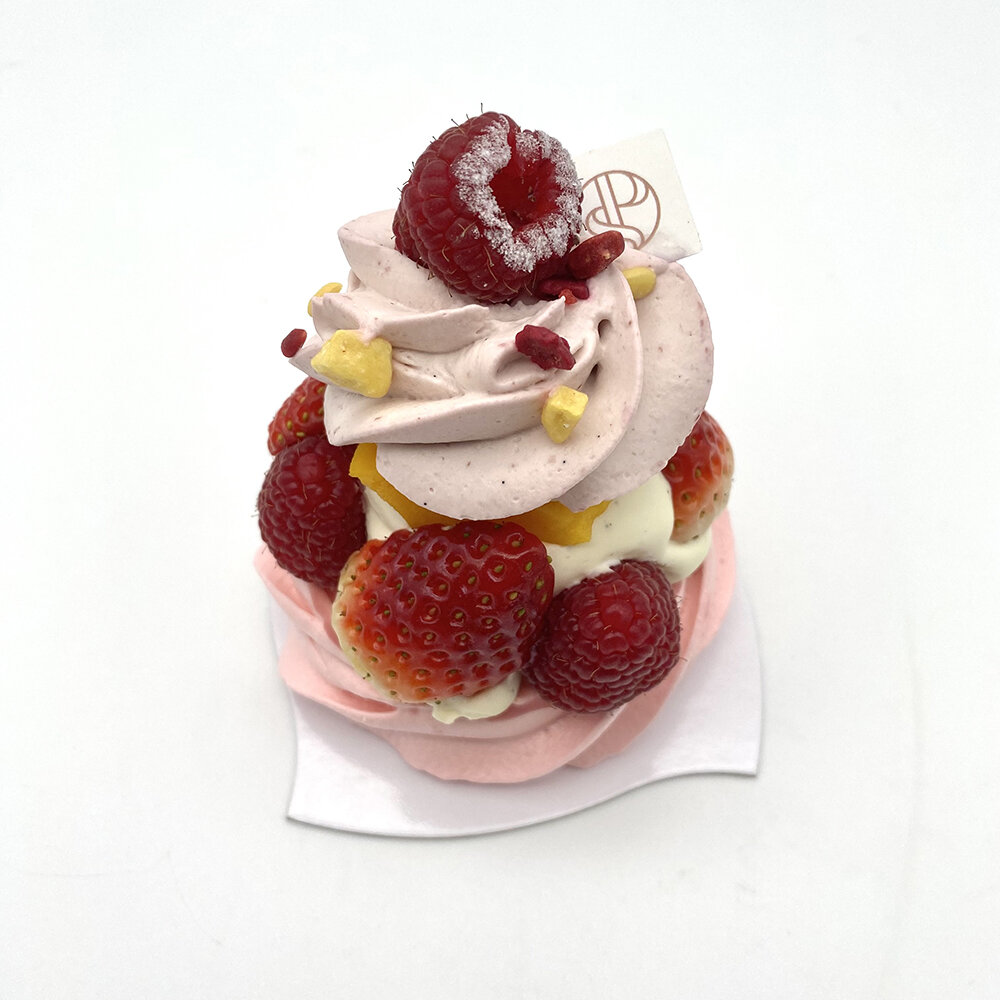 Mousseline vanille, mangue, fraises et framboises, chantilly fruits rouges, fond meringué