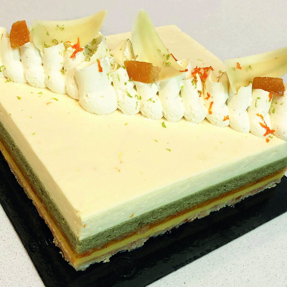 Crème légère mandarine/yuzu, compotée exotique, croustillant aux agrumes, pain de Gênes au thé vert Matcha.
