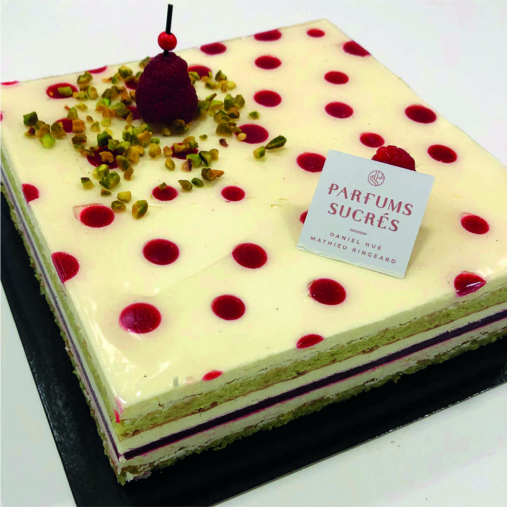 Crémeux Vanille, confit de framboises, biscuit Amandes pistache.