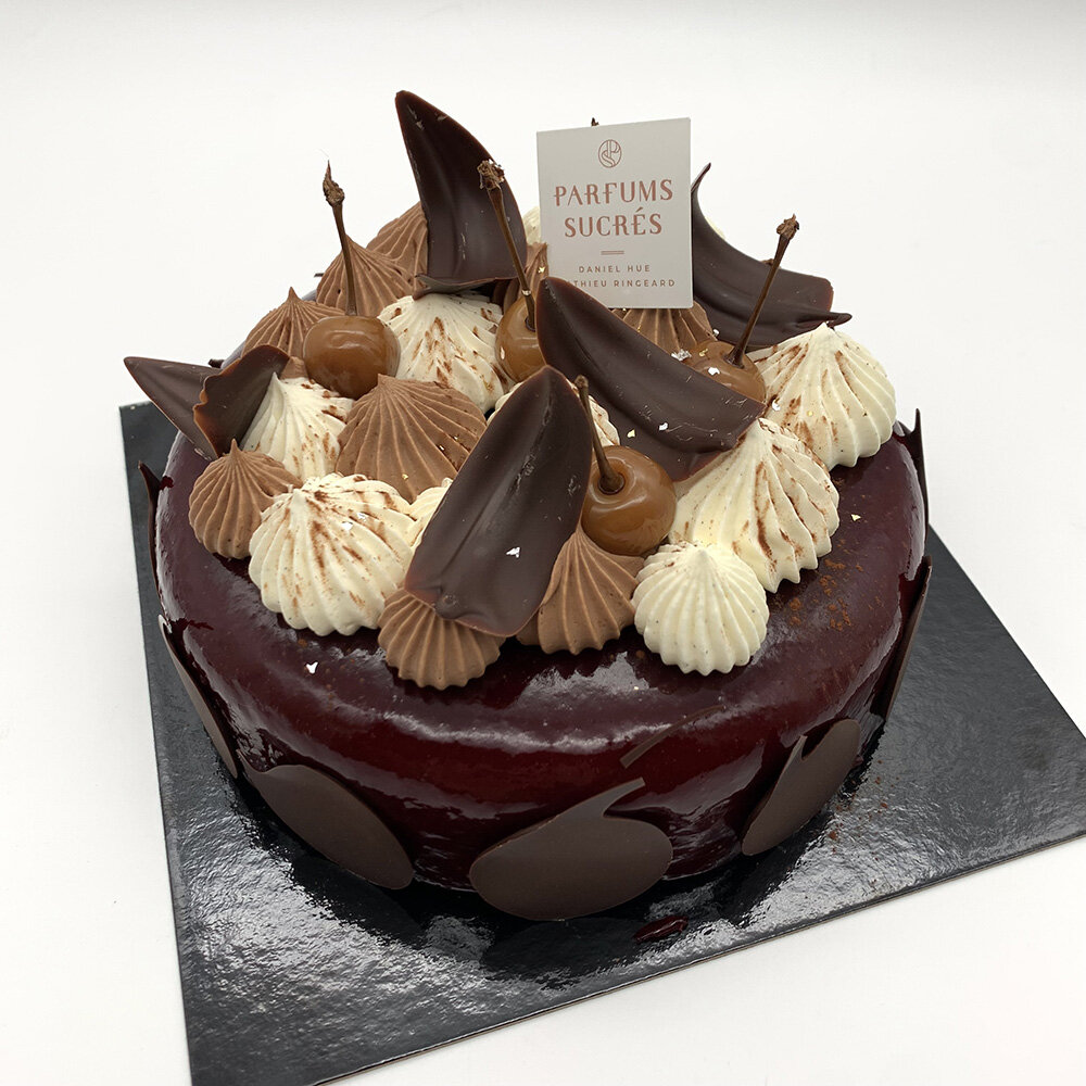 Crémeux chocolat noir parsemé de griottes au kirsch, confit de griotte, chantilly au kirsch, biscuit chocolat.