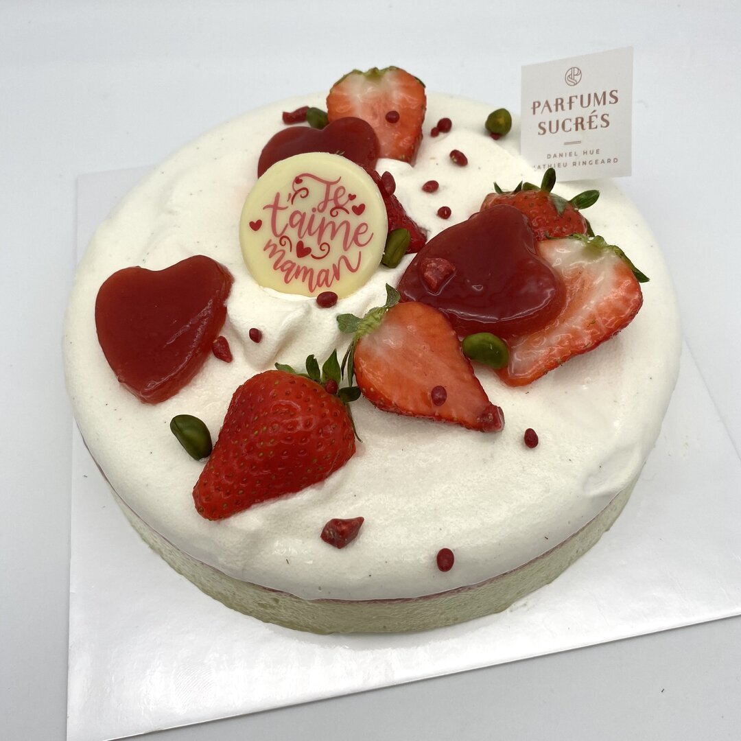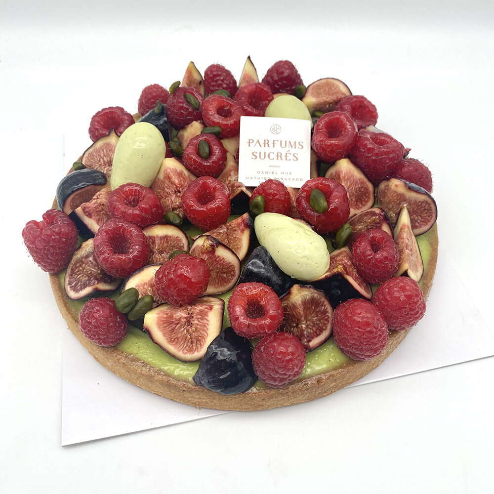 Sablé breton, crème au choix : vanille / chocolat / framboise / fruit de la passion, décor de fruits rouges ou fruits jaunes, macarons et fleurs